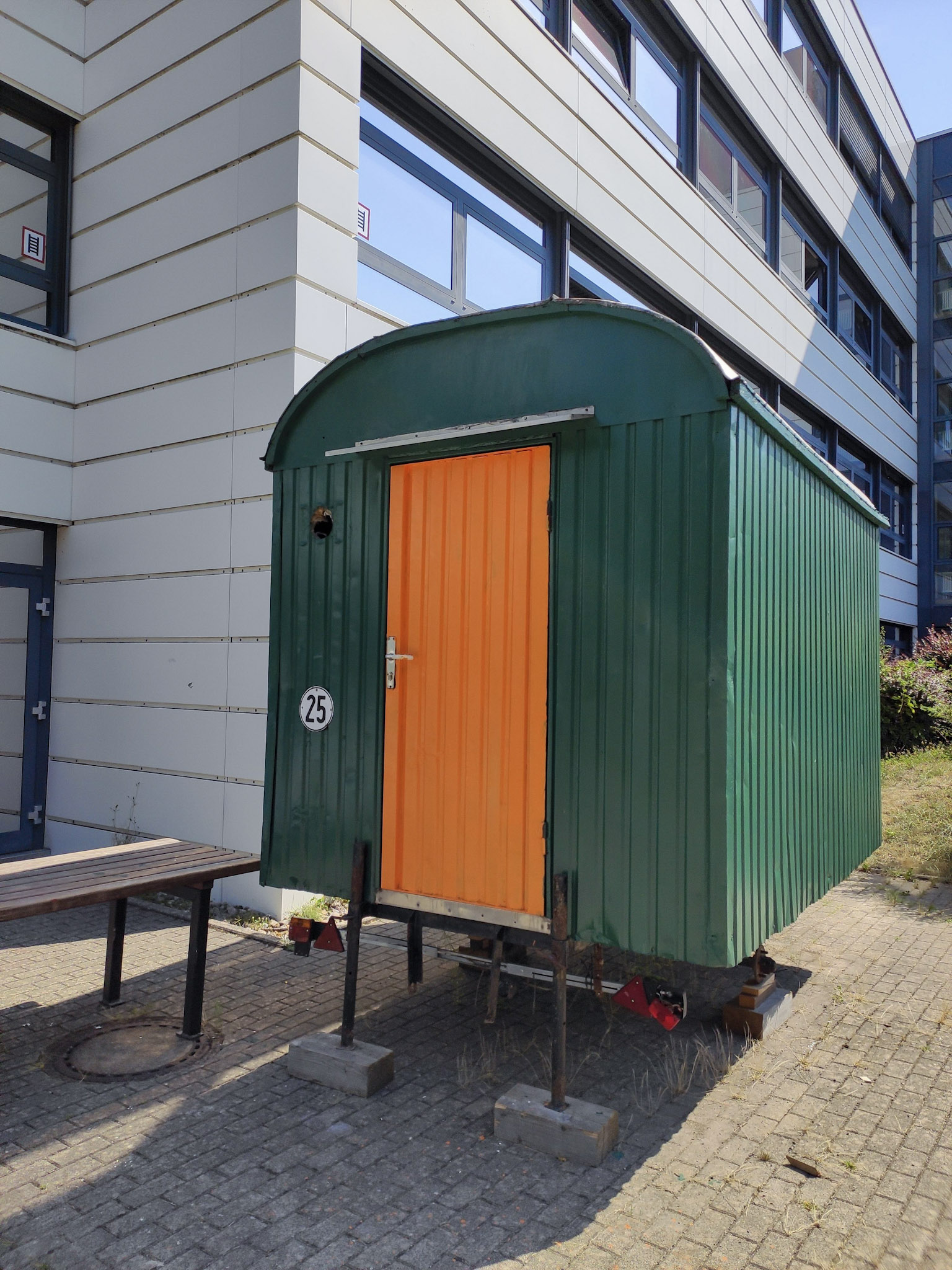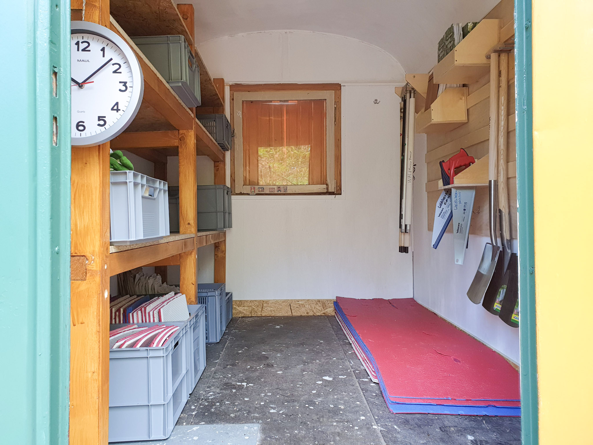 Die Einrichtung unseres Waldklassenzimmers wurde an die Erfordernisse verschiedener Unterrichtsformen angepasst: Der Sitzkreis und die fünf Sitzgruppen ermöglichen das Arbeiten vergleichbar mit einem Klassenzimmer. Im Lehrer-Schüler-Gespräch einerseits und in Partner-, Gruppen- oder Einzelarbeit andererseits. Viele wichtige Unterrichtsmaterialien lagern im dazugehörigen Bauwagen, der von den ASG-Lehrern Swen Löbbicke und Ivo Stilling renoviert und passend eingerichtet wurde.